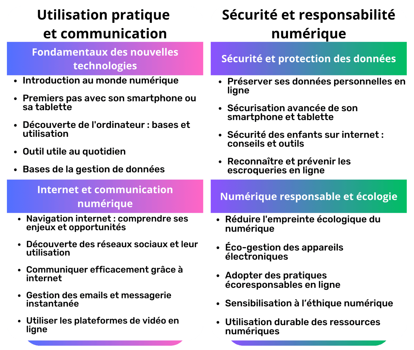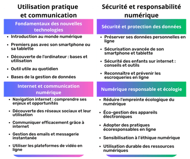 Dalinfo offre des formations approfondies dans les nouvelles technologies, idéales pour tous les niveaux d'apprentissage. Nos cours couvrent une vaste gamme de sujets essentiels, en mettant l'accent sur une pédagogie interactive, pratique et personnelle.