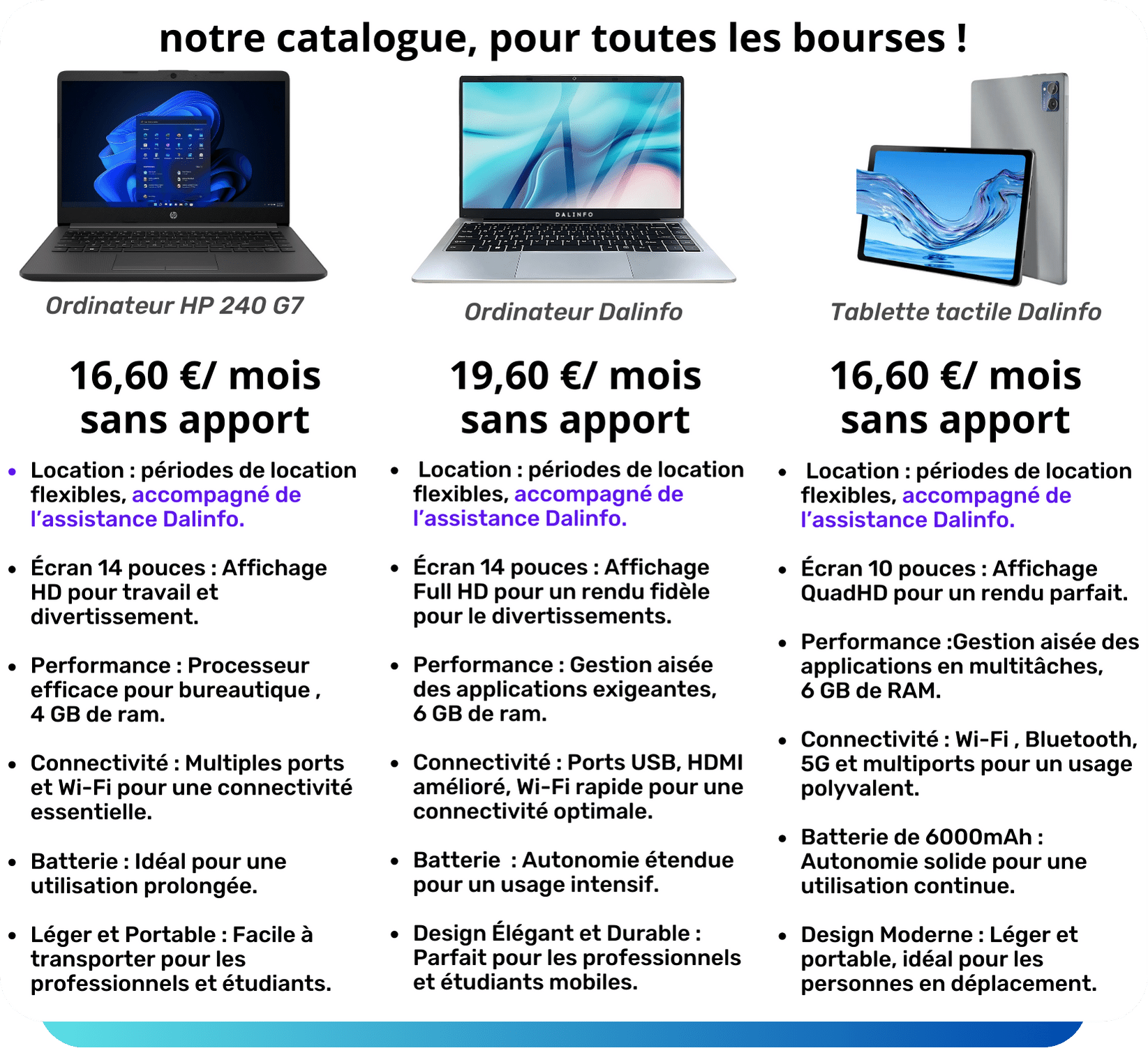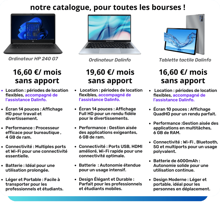 Dalinfo offre une gamme complète de services informatiques, comprenant des cours d'informatique, la location de matériel et une assistance 24/24.